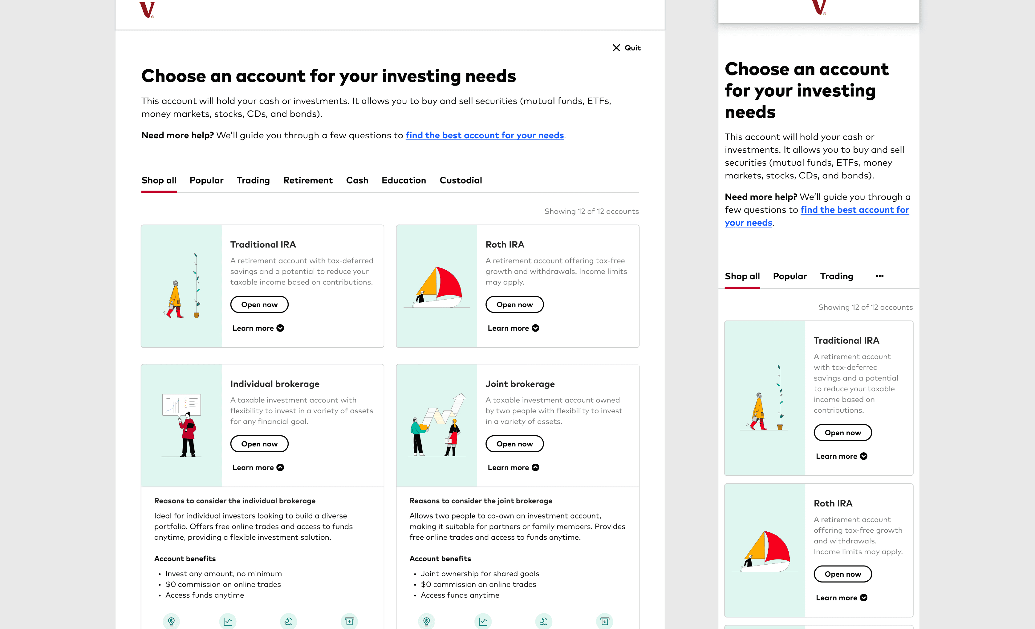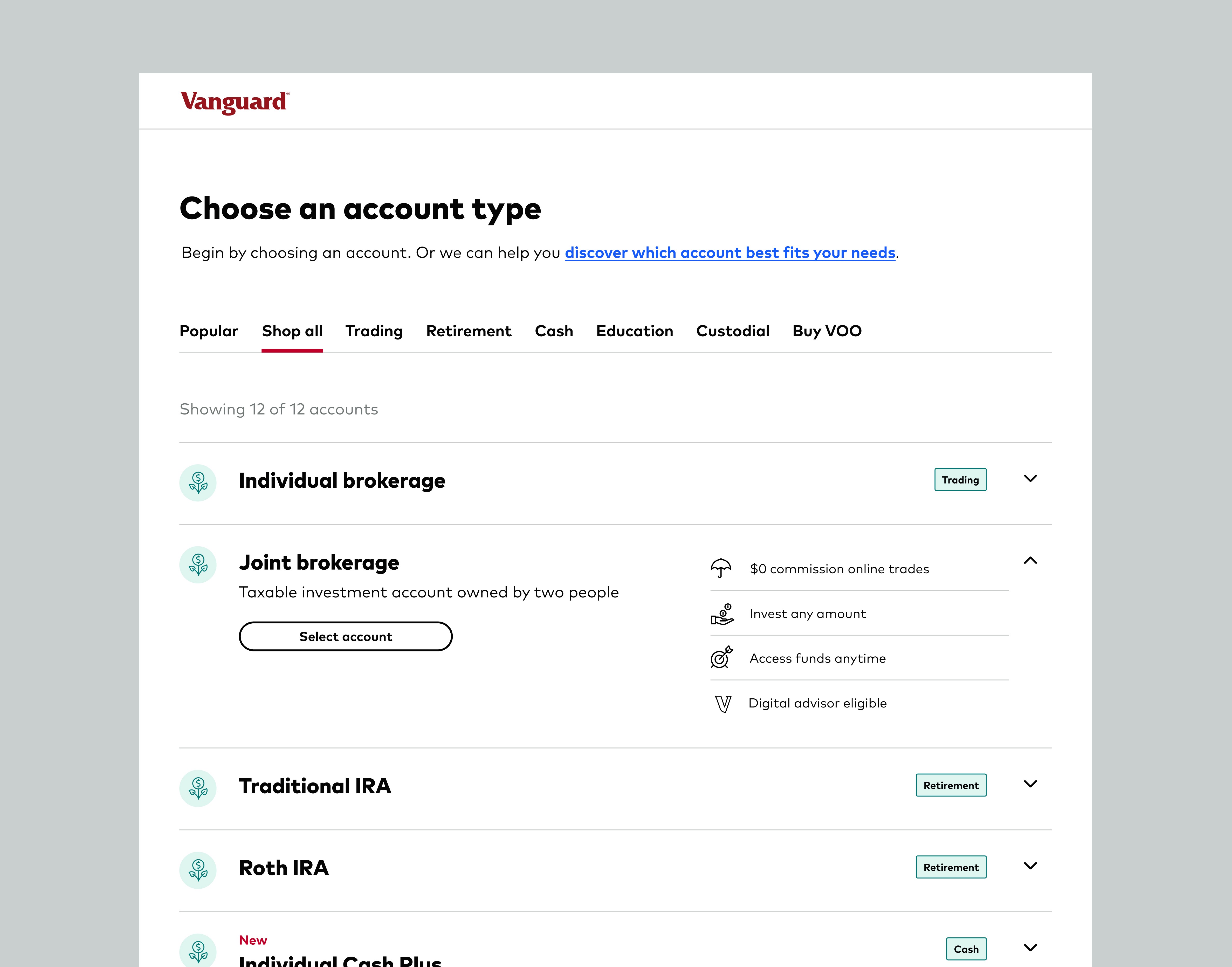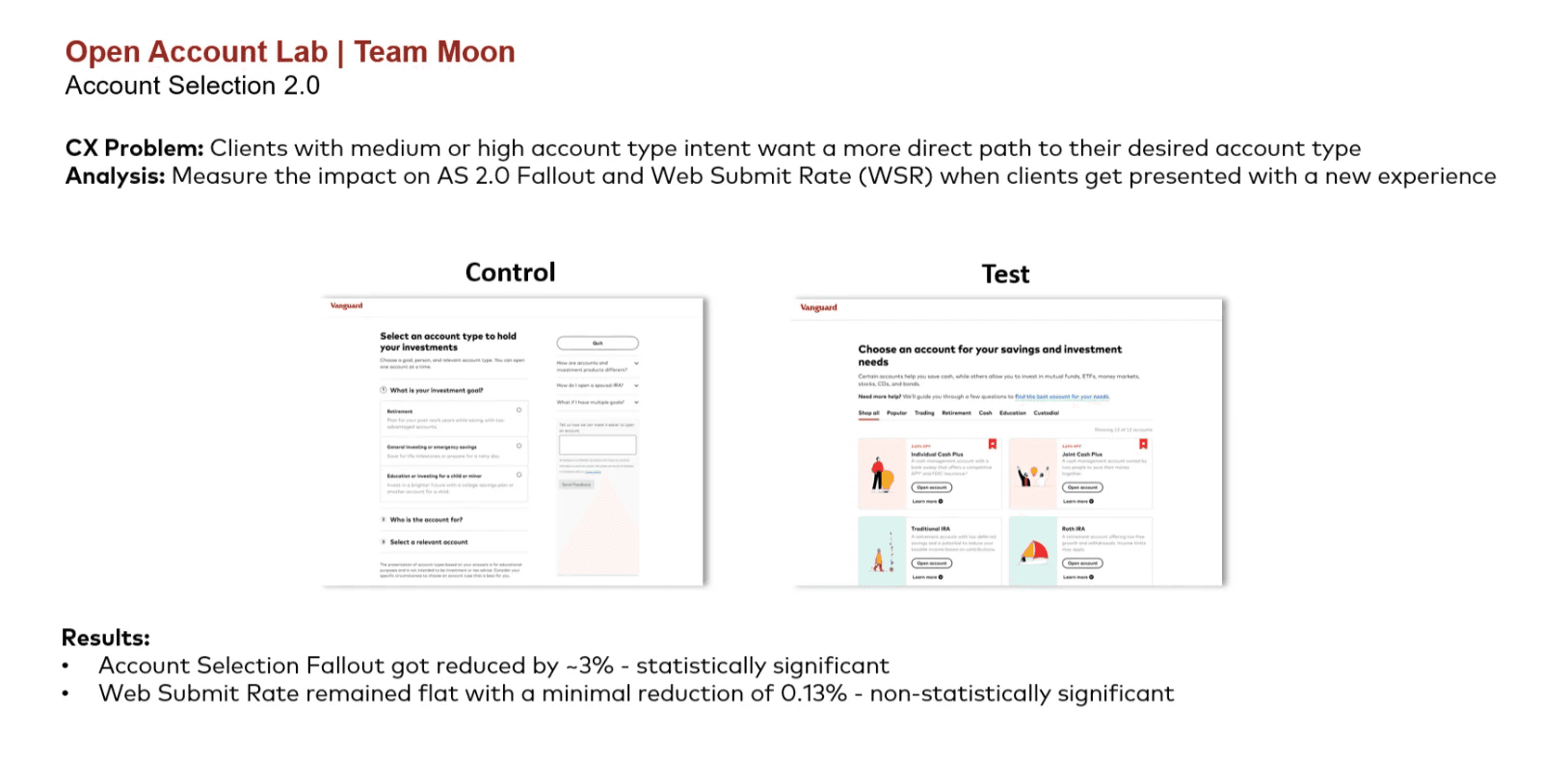 I redesigned Vanguard’s account selection step to reduce decision friction and increase investor confidence during onboarding. By simplifying comparisons and adding guided decision support within existing system constraints, the experience became easier to understand and act on—driving a measurable lift in account openings and lower fallout.