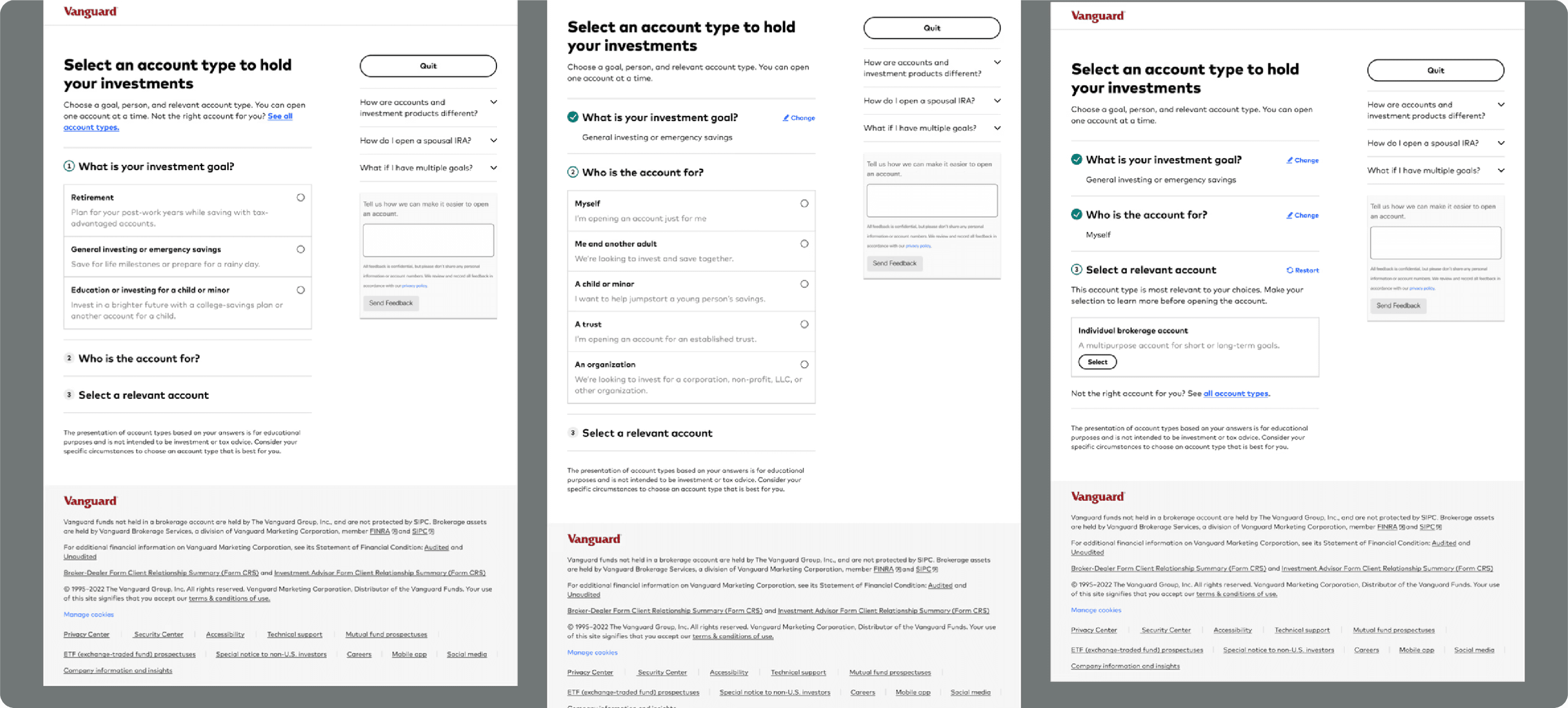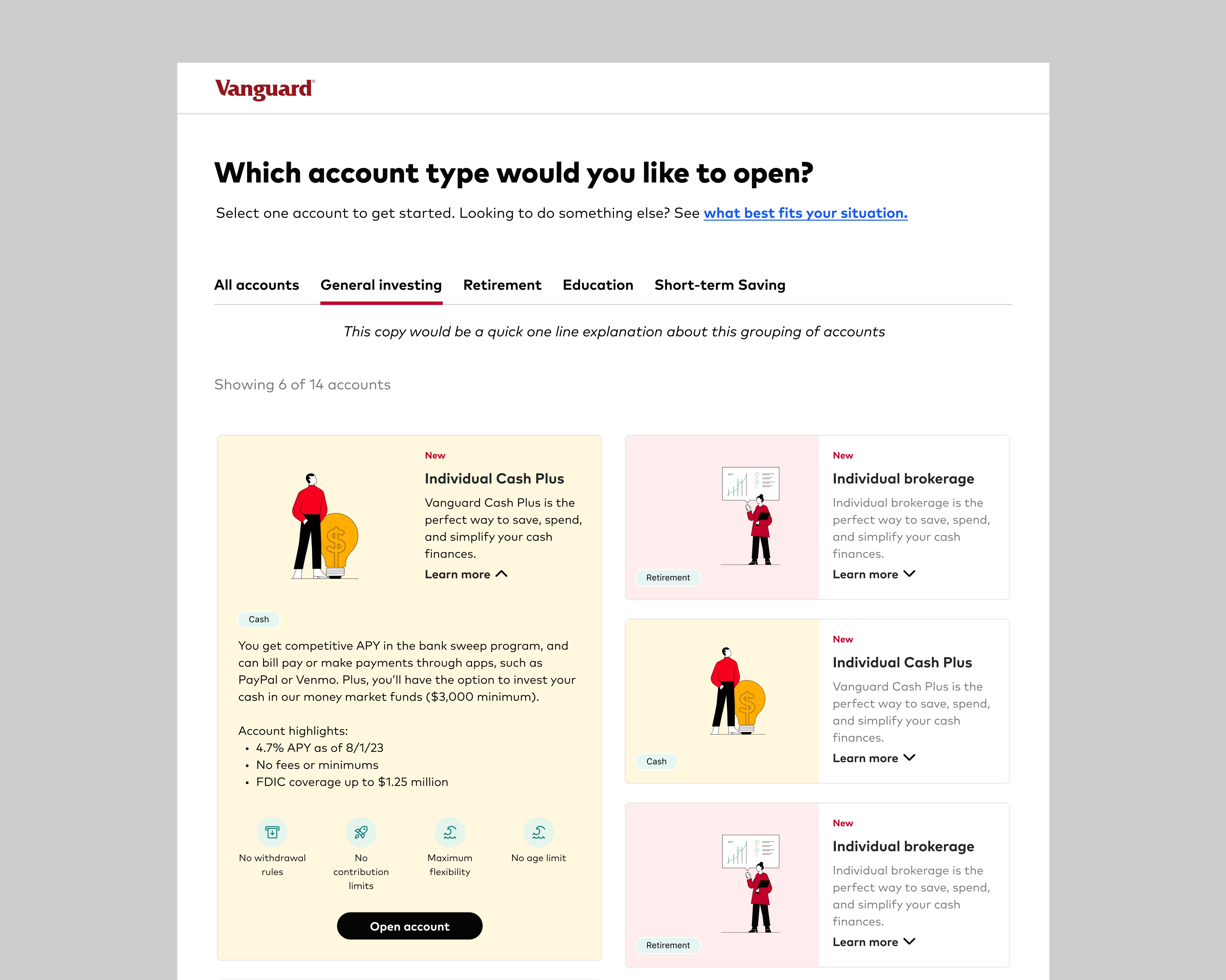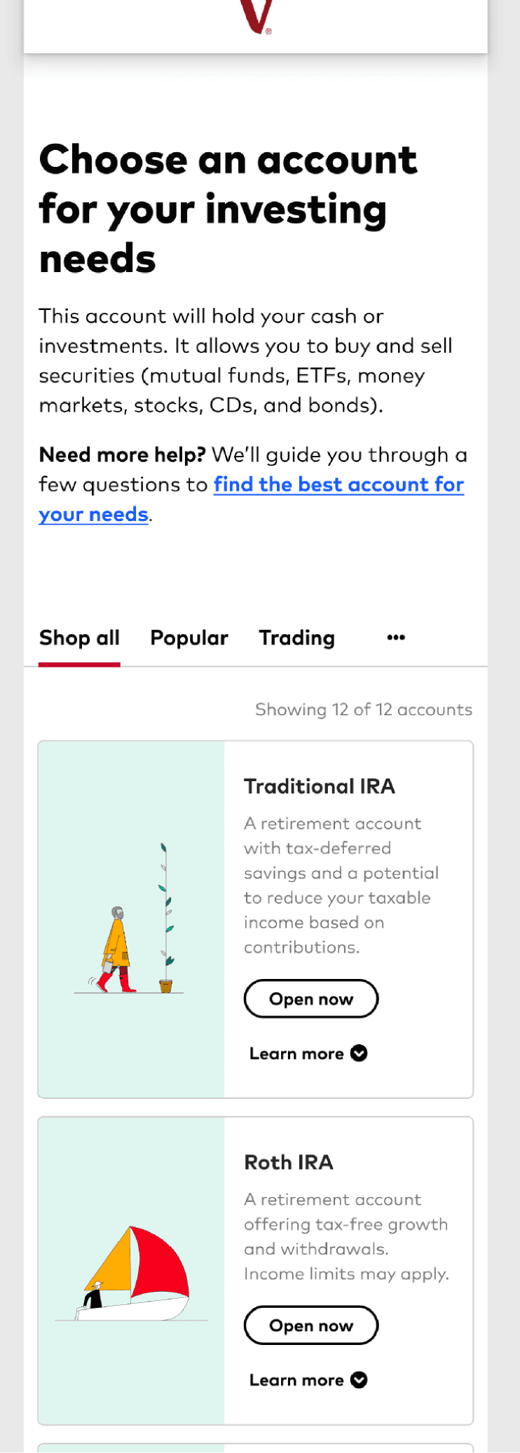I redesigned Vanguard’s account selection step to reduce decision friction and increase investor confidence during onboarding. By simplifying comparisons and adding guided decision support within existing system constraints, the experience became easier to understand and act on—driving a measurable lift in account openings and lower fallout.